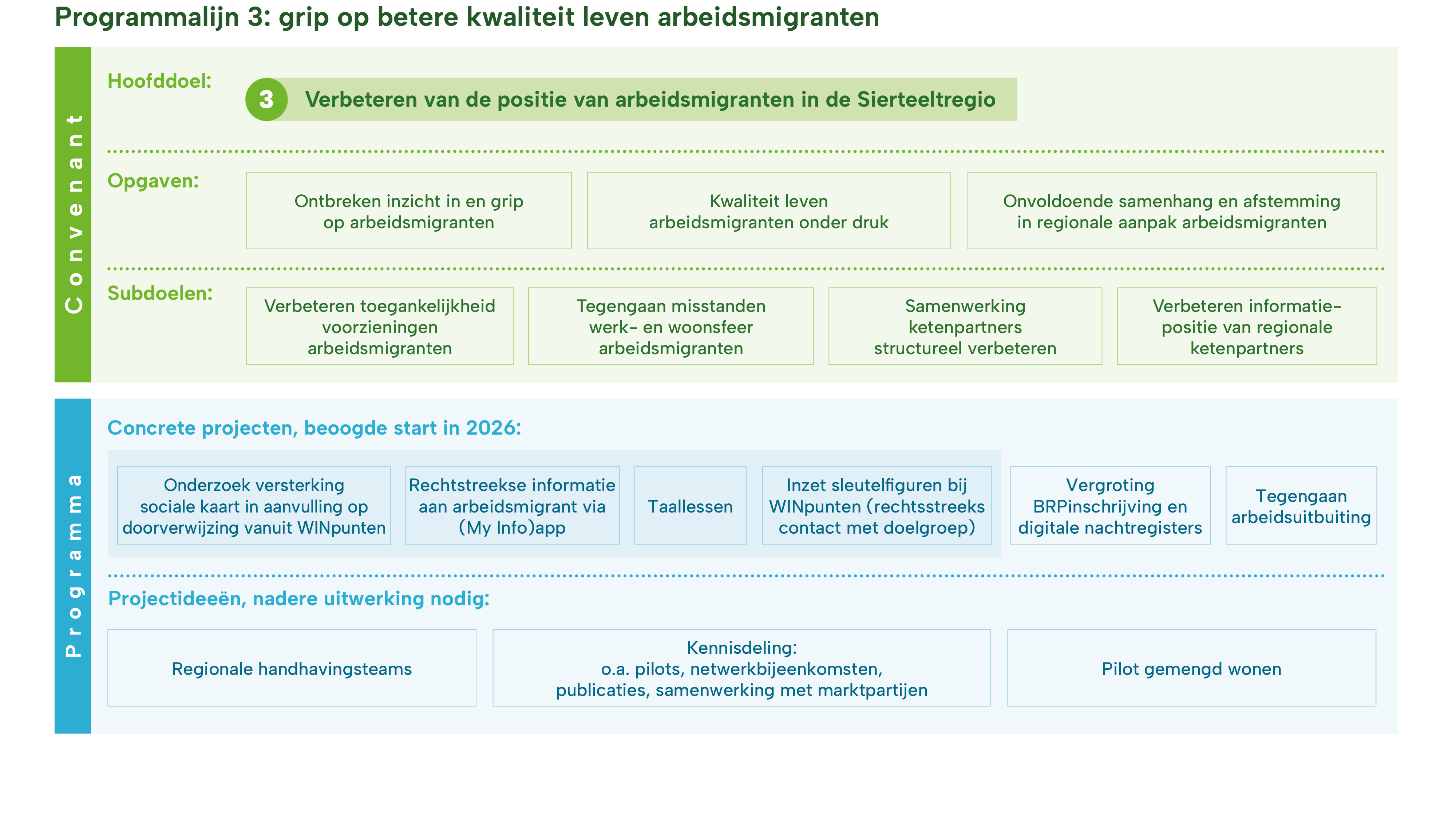 De derde programmalijn is gericht op het verbeteren van de positie van arbeidsmigranten in de regio en draagt bij aan het verbeteren van het welzijn van arbeidsmigranten en het versterken van de integrale, regionale ketenaanpak voor arbeidsmigranten. Deze opgave is urgent omdat de kwaliteit van leven van arbeidsmigranten onder druk staat, onder andere door misstanden in de woon- en werksfeer. Daarnaast ontbreekt het aan voldoende samenhang en afstemming in de regionale aanpak, waardoor de ondersteuning en bescherming van arbeidsmigranten niet altijd effectief of consistent is.